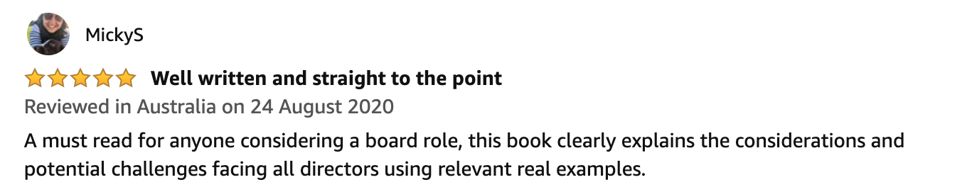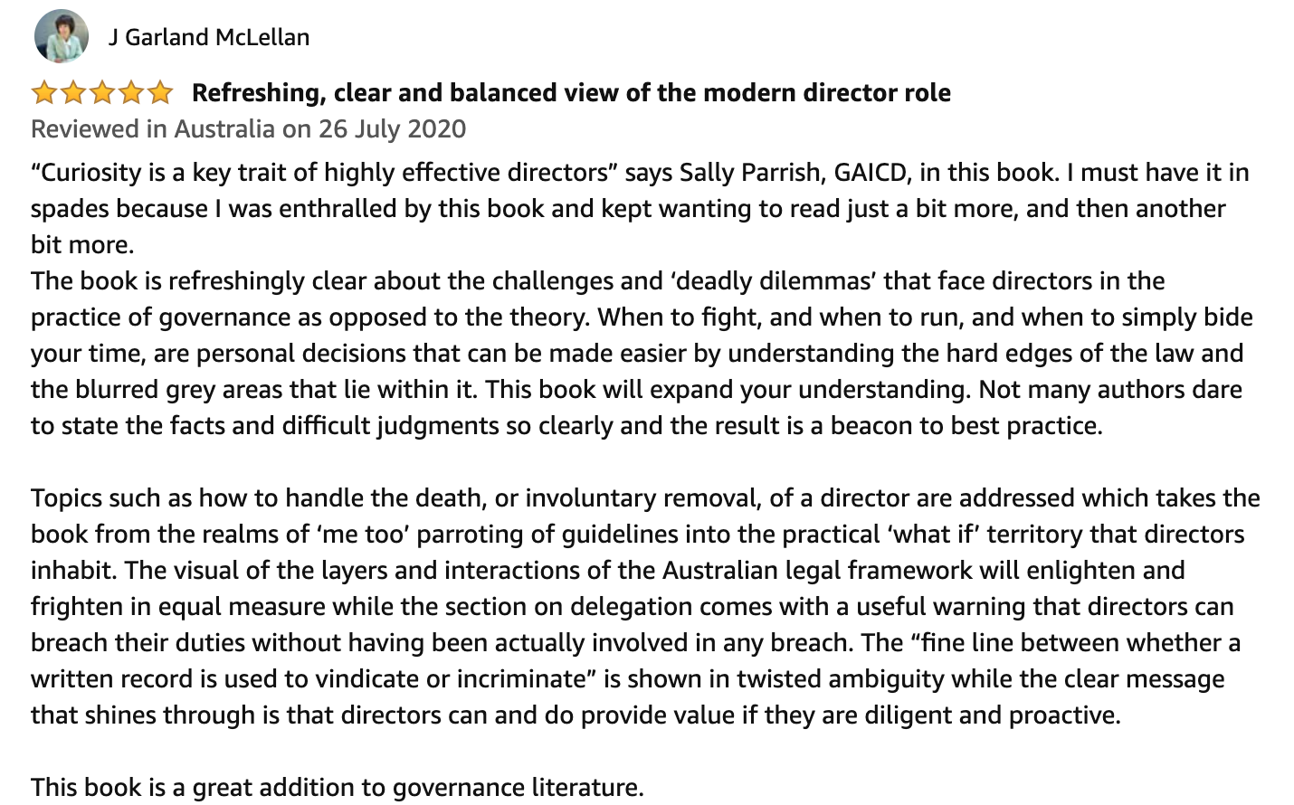 The book is gathering incredible testimonials and is fast becoming the 'go-to guide for company directors at all stages of experience in Australia. I am incredibly proud of the book and of the impact it is having in our boardrooms.